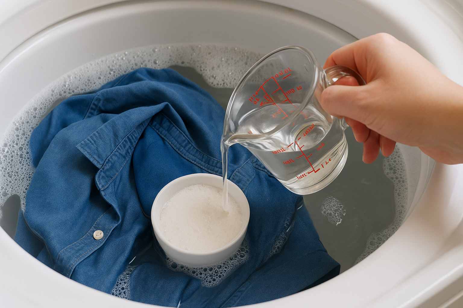 Шаг 2. Замачивание с уксусом. Наполните таз тёплой водой, добавьте 1 стакан 9% уксуса и замочите одежду на 1-2 часа. Это поможет устранить запах, частично дезинфицировать ткань и смягчить волокна. После замачивания хорошо отожмите одежду.