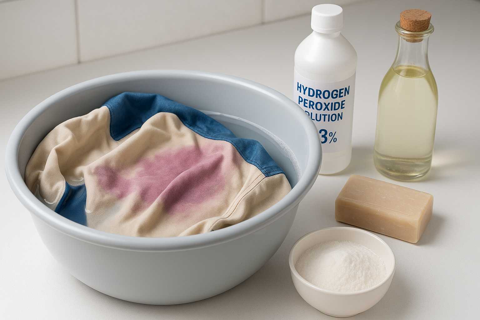 - Перекис водню 3% — один із найдоступніших і щадних методів. Розведіть 50 мл перекису на 5 л теплої води та замочіть річ на 1–2 години. Потім ретельно прополощіть. Для делікатних тканин краще використовувати кисневі відбілювачі без хлору.