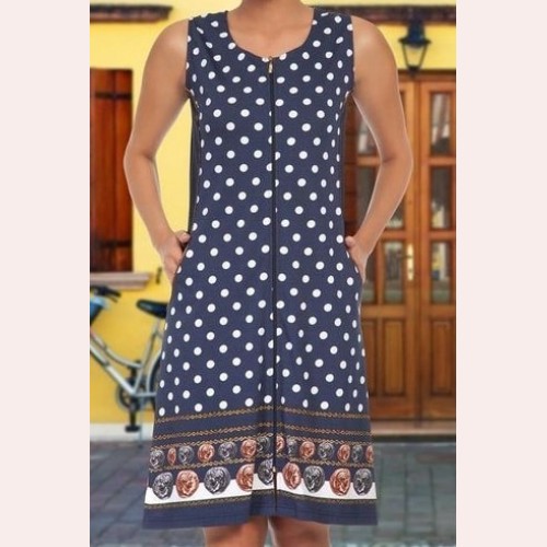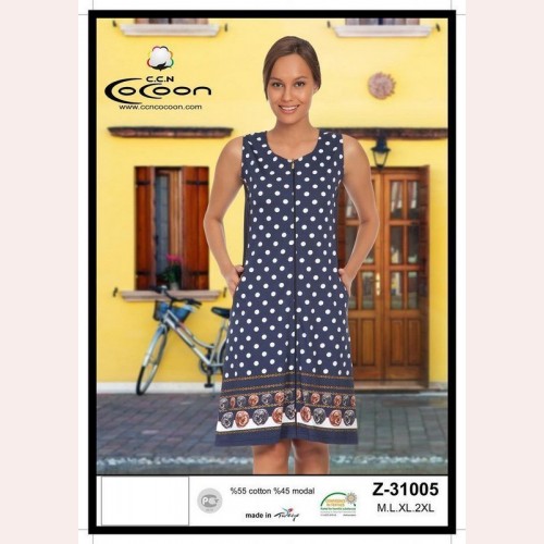 Модний жіночий халат від Турецького виробника ТМ "Cocoon". Нова модель річного халата в білосніжний горошок, неглибокий круглий виріз, застібка-блискавка. Легкий літній без рукавів. Халат для дому та відпочинку на морі. Жіночий бавовняний халат - дуже приємний тілу, не линяє, не електризується. Досить купити бавовняний халат без рукавів і насолоджуватися високою якістю і недорогою ціною товару.Виробництво: Туреччина ТМ "Cocoon"