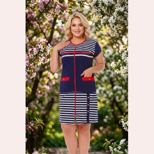 Жіночий халат на блискавці в смужку - це зручна, практична та стильна модель для дому і щоденного носіння. Халат виготовлений зі 100% бавовни, тому тканина приємна до тіла, добре пропускає повітря і забезпечує комфорт протягом усього дня. Така модель чудово підходить для жінок, які шукають красивий і зручний домашній одяг великих розмірів.