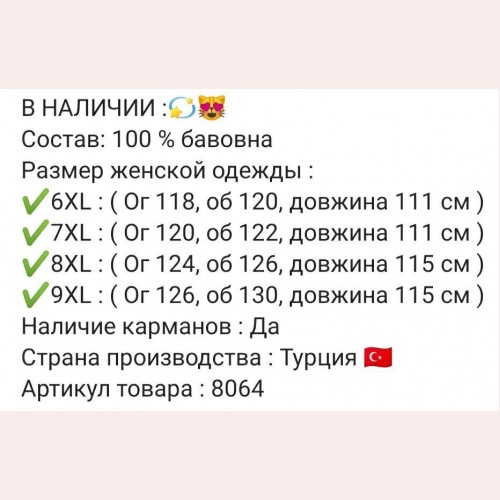 - Розміри 6XL - (ОГ 118 см, ОБ 120 см, довжина 111 см) 7XL - (ОГ 120 см, ОБ 122 см, довжина 111 см) 8XL - (ОГ 124 см, ОБ 126 см, довжина 115 см) 9XL - (ОГ 126 см, ОБ 130 см, довжина 115 см)