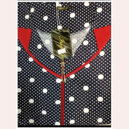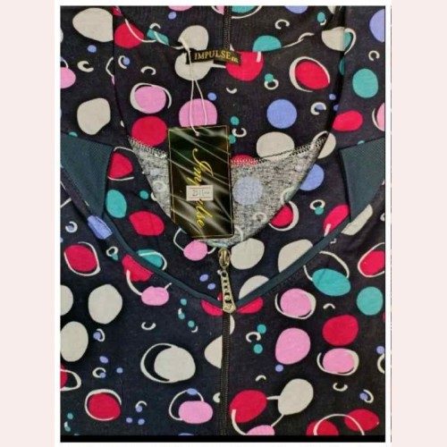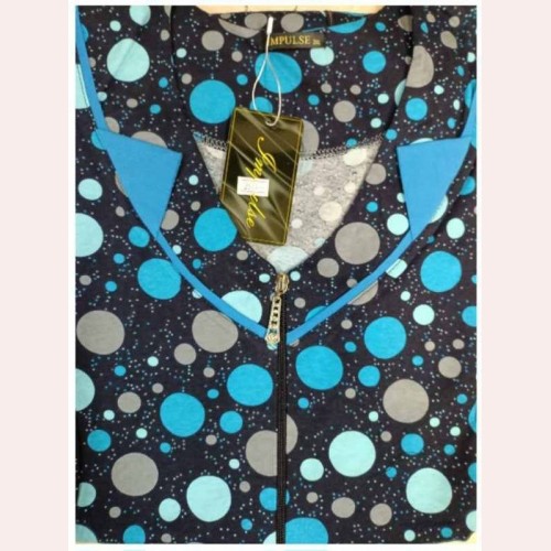 Стильний дизайн з сучасним принтом у вигляді кругів додає образу яскравості та індивідуальності. Зручна застібка на блискавці дозволяє швидко одягати та знімати халат, а практичні кишені додають функціональності.