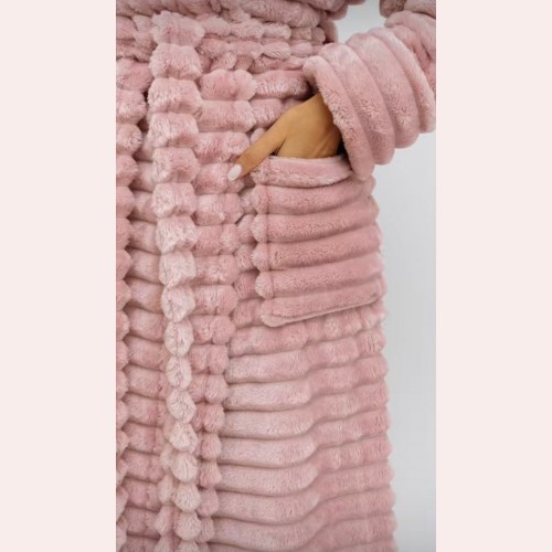 Жіночий махровий халат Шарпей у кольорі пудра поєднує ніжність, комфорт і тепло. М’яка пухнаста тканина велсофт приємна до тіла, добре зігріває та дарує відчуття затишку під час носіння.