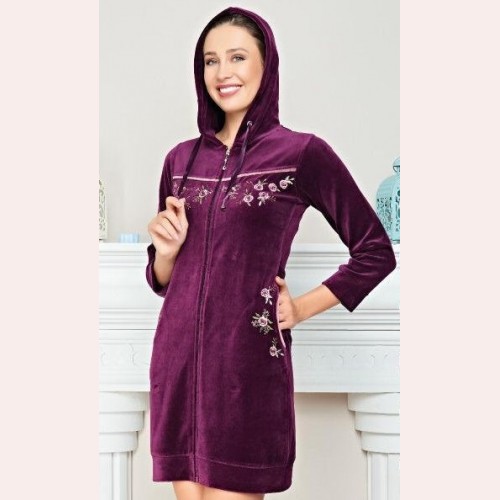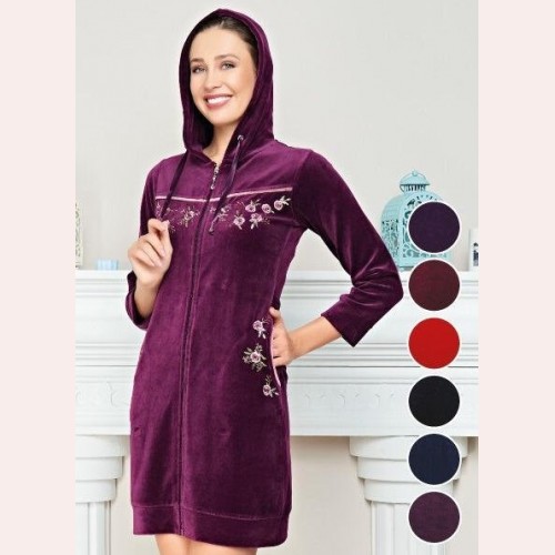 Халат велюровий з капюшоном. Гарний халат для дівчат і жінок. Довжина халата до коліна, на грудях і кишенях вишивка з дрібних квіточок. Розміри халатів від 44 до 54. Велюрова тканину халата добре переносить прання у пральній машині, не линяє і не сідає. Халат велюровий дуже багато і красиво виглядає, він стане відмінним подарунком для жінок. Досить купити короткий велюровий халат і ви відчуєте комфорт і затишок в домашній обстановці.