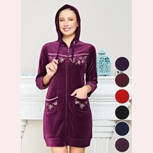 Інтернет магазин "Закупка 24" пропонує нове надходження жіночих велюрових халатів з Туреччини. Нова модель модного жіночого халата з капюшоном сподобається нашим покупцям. Халат на змійці з рукавом три-чверті, довжина халата до коліна 100 см. В залежності від розміру. На халаті є зручні кишені, пояс зав'язується ззаду. Велюровий халат з красивою вишивкою на грудях і кишенях, розміри халатів від 42 до 50. Гарний жіночий велюровий халат з капюшоном добре переносить прання у пральній машині, не линяє і не сідає. Досить купити гарний велюровий халат з капюшоном і він стане відмінним подарунком для жінок.