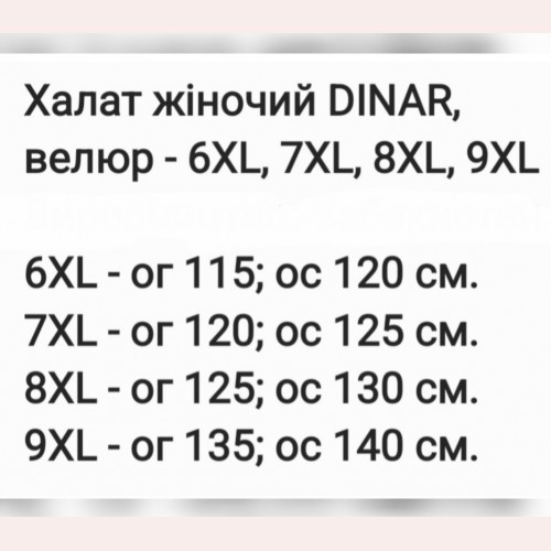 - Розміри 6XL - ОГ 115 см, ОБ 120 см 7XL - ОГ 120 см, ОБ 125 см 8XL - ОГ 125 см, ОБ 130 см 9XL - ОГ 135 см, ОБ 140 см
