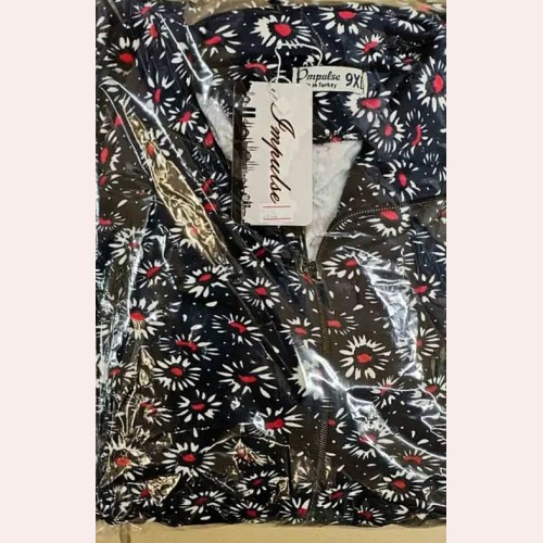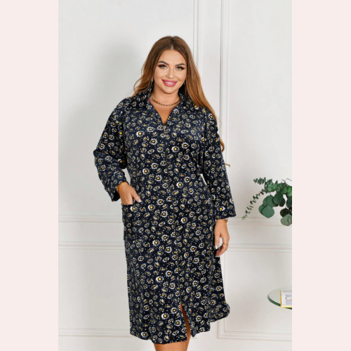 Жіночий велюровий халат на блискавки. Халат на бавовняній основі, довжина халата за коліно, є кишені. Велюрова тканина халата добре переносить прання у пральній машині, не линяє і не сідає. Приємний візерунок на темно-синьому тлі. Досить купити Жіночий велюровий халат великих розмірів, і він стане відмінним подарунком для жінок великих розмірів!