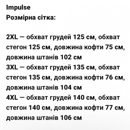 - Розміри 2XL - (52-54) обхват грудей 125 см обхват стегон 125 см довжина кофти 75 см довжина штанів 102 см. 3XL - (56-58) обхват грудей 135 см обхват стегон 135 см довжина кофти 76 см довжина штанів 104 см. 4XL - (60-62) обхват грудей 140 см обхват стегон 140 см довжина кофти 77 см довжина штанів 106 см.
