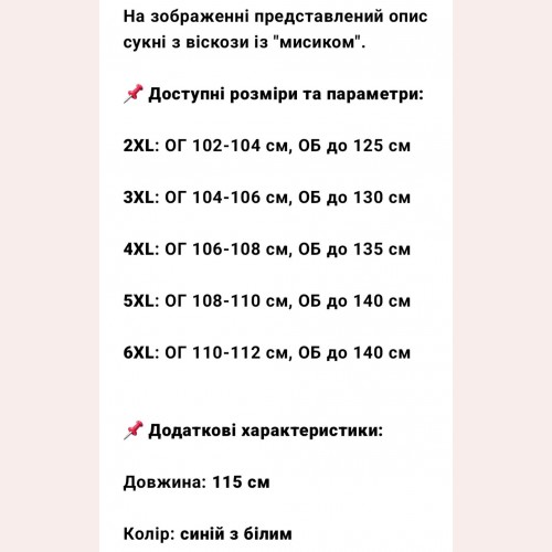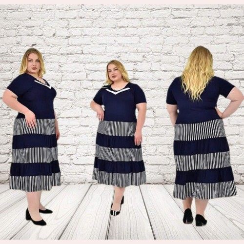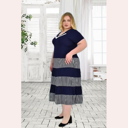 Жіноча сукня великого розміру, виконана з м’якої, приємної до тіла віскози. Матеріал добре тягнеться, забезпечуючи комфорт протягом усього дня. Верх моделі однотонний, темно-синій, із V-подібним вирізом, прикрашеним декоративним “мисиком” у біло-синіх тонах. Низ сукні — зі вставками в смужку, які чергуються з однотонними елементами, створюючи візуально стрункий силует.