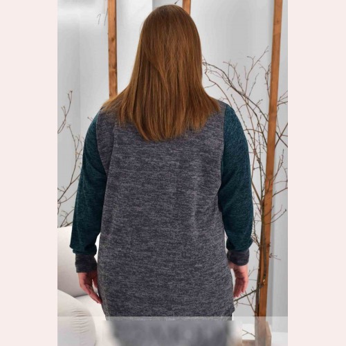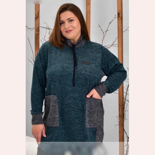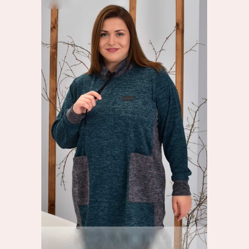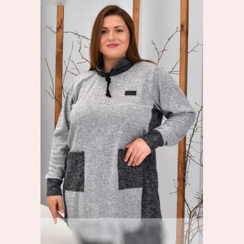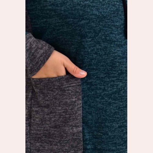 Туника имеет прямой свободный крой, который не сковывает движений, а короткая застежка-шнурок у воротника-стойки добавляет современный акцент. Спереди расположены два больших накладных кармана, которые делают модель максимально практичной. Контрастные вставки более темного цвета визуально вытягивают силуэт и подчеркивают форму.