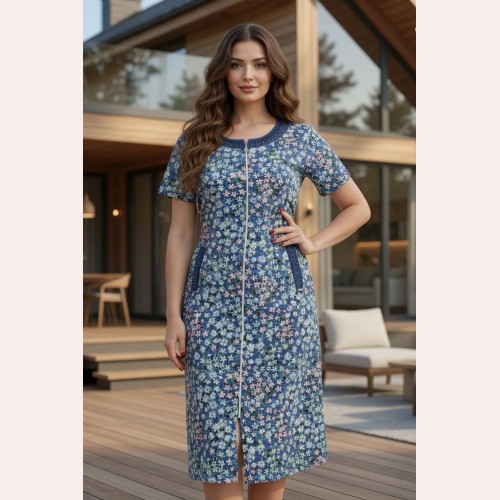 Женский халат на молнии - это удобная и практичная модель для дома, отдыха и ежедневного использования. Халат выполнен в нежной сине-голубой гамме с мелким цветочным принтом, который придает образу легкость, свежесть и женственность. Такой фасон отлично подходит для теплого времени года и дарит комфорт в течение всего дня.
