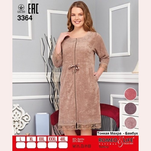 Халат из тонкой махры, длина за колено, рукав три-четверти. Халат со вставками из кружева, пояс-кулиса на талии, размеры халатов полномерные от 46 до 56. Ткань халата хорошо переносит машинную стирку, не линяет и не садится. Женский халат с смотрится очень богато, он станет отличным подарком для женщин. Достаточно купить халат женский тонкая махра и носить с большим удовольствием долгое время!