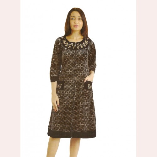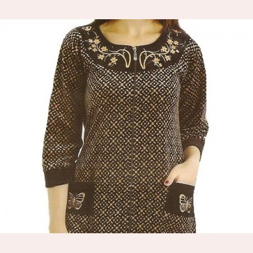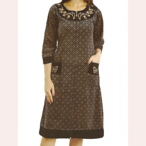 Предлагаем красивый женский халат из велюра с вышивкой. Халат на молнии с рукавом три-четверти, длина халата 110 см. Халат с модной красивой вышивкой на груди и на карманах, размеры халатов от 50 до 56. Велюровая ткань халата хорошо переносит машинную стирку, не линяет и не садится. Халат с вышивкой смотрится очень богато, он станет отличным подарком для женщин. Достаточно купить велюровый халат с вышивкой и носить с большим удовольствием долгое время.