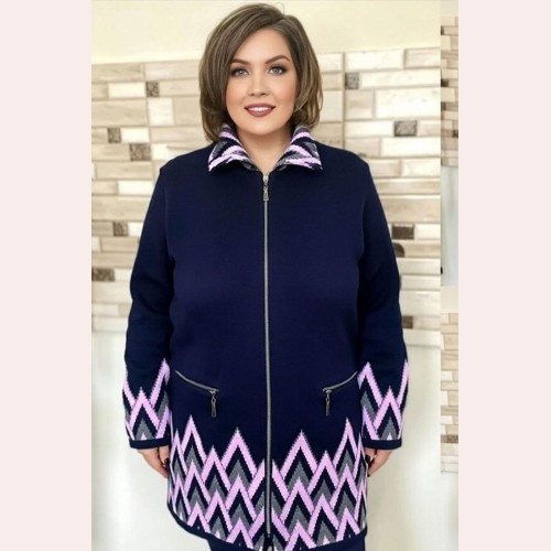 Модель имеет темно-синюю основу, которая выглядит сдержанно, практично и легко сочетается с разной одеждой. Нижняя часть кардигана украшена крупным зигзагообразным орнаментом в розовых, серых, черных и темно-синих оттенках. Такой же узор повторяется на нижней части рукавов и на воротнике, благодаря чему модель выглядит завершенно и гармонично. Кардиган застегивается на молнию по центру. Воротник высокий, мягкий, с узором, хорошо прикрывает шею. Рукав длинный, удобный для прохладной погоды. Спереди расположены два кармана на молнии, которые добавляют модели практичности и современного вида. Длина изделия зависит от размера и составляет примерно от 80 до 90 см.