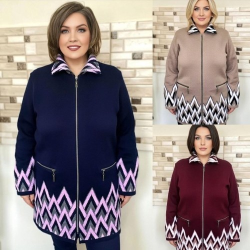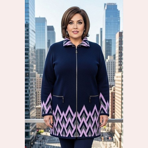 Большой вязаный кардиган это практичная и красивая модель для женщин, которые ценят тепло, комфорт и аккуратный внешний вид в повседневной одежде. Кардиган выполнен в темно-синем цвете, имеет застежку на молнии, удобные карманы и выразительный зигзагообразный узор в нижней части изделия и на рукавах. Модель пользуется большим спросом, так как хорошо подходит для прохладной погоды, ежедневной носки, прогулок, работы и домашнего комфорта.